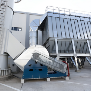 A mechanical device that moves air/gas through ducts and pollution control equipment to the exhaust stack. Uses kinetic energy to create negative pressure, drawing air in and accelerating it radially outward via centrifugal force